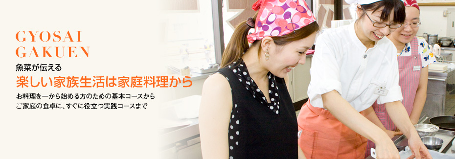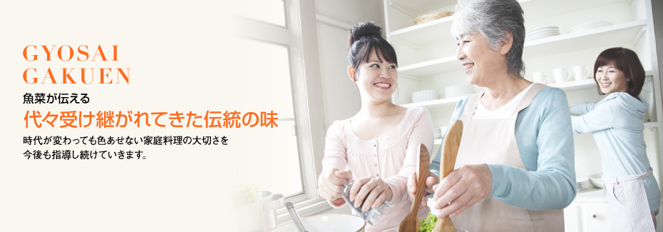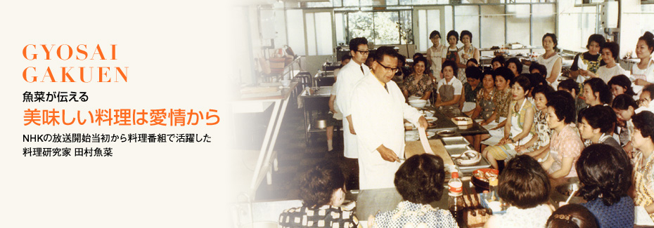 当学園創設者・田村魚菜は、皆さんに手作りの家庭料理を基本からしっかり学んでいただきたい、 との思いを込めて「魚菜学園・自由が丘お料理学校」を創立しました。変わらず伝え続けてきた魚菜のオリジナル家庭料理、 そのレシピを体感してください。懐かしくて温かい手作りの味、これからも建学の精神にもとづいて、心を込めてご指導いたします。